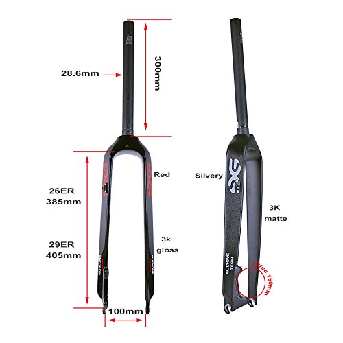 Nombre: horquilla para bicicleta de montaña rodado 26/29; material: carbono T800 de importación; trama: 3K; acabado: mate; freno: freno de disco; longitud del tubo vertical: (tubo cónico) 300 mm; diámetro: 28,6 mm; peso aproximado: 450 g; ideal para ruedas: rodado 26/29; color: rojo/blanco.